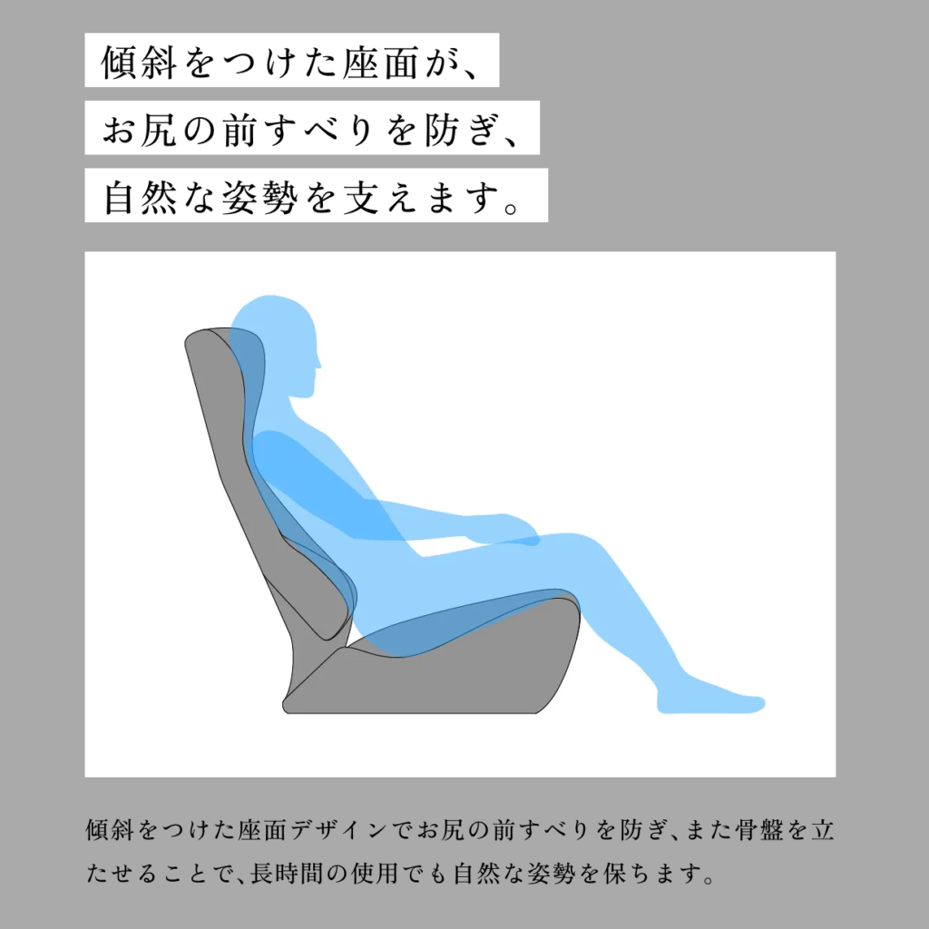 この「KOSHIKAMI THE PRIME」は、座面が後方に傾斜しており、骨盤が自然と立つような構造になっています。